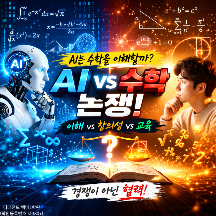 안녕하세요~ 더레전드 학원 전수정쌤 입니다.ᐟ.ᐟ.ᐟ 요즘 수학자들이 실제로 논쟁하는 문제 “AI가 국제수학올림피아드(IMO) 금메달 수준의 문제를 풀었다.” 2025년 여름, 이런 제목의 뉴스가 전 세계를 떠들썩하게 했습니다. 많은 분들은 드디어 인공지능이 인간의 마지막 지성 영역인 수학마저 정복한 것 아니냐고 생각하셨을지도 모릅니다. 그런데 정작 수학자들의 반응은 다소 달랐습니다. 놀라움보다는 불편함, 그리고 매우 진지한 논쟁이 이어졌습니다. 그 이유는 무엇일까요? 현재 수학계에서 벌어지고 있는 논쟁의 핵심은 다음 질문으로 압축됩니다. AI는 정말로 수학을 ‘이해’하고 있는 것일까요? 아니면 이해하는 것처럼 행....... <img src="https://blogthumb.pstatic.net/MjAyNjAzMzBfMjQy/MDAxNzc0ODcwNTgxMzI0.RoRClOmPk21w1TIn_7tr1-H_MlL4qKti1qwgqvzsNjMg.Y1ydXGrcjadfvrEb04zSvwLD8Ovbzc75CAEu0mcNl6Ug.PNG/%B4%F5%B7%B9%C0%FC%B5%E5_%B9%E9%B8%B62%C7%D0%BF%F8_%28%C7%D0%BF%F8%B5%EE%B7%CF%B9%F8%C8%A3_%C1%A63807%29.png?type=s3" />
