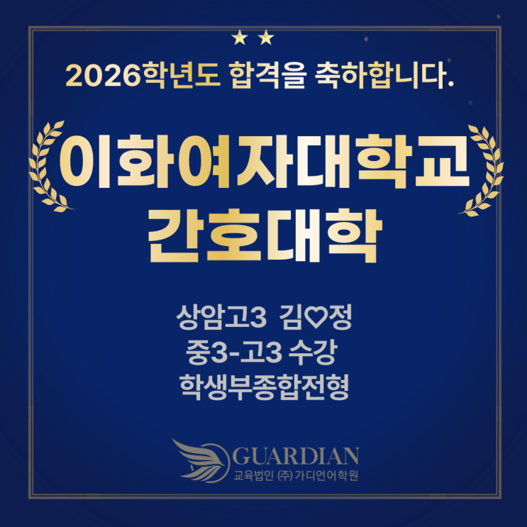 안녕하세요 :) 학생부종합전형으로 이화여대 간호대학 합격 소식 전해드립니다. 내신과 학생부 모두 빈틈없이 준비해야 하는 곳이기에 더 의미 있는 합격입니다. 오랜 시간 가디언과 함께하며 흔들리지 않고 내신 관리와 학생부를 차곡차곡 쌓아온 학생인데요. 그 꾸준함이 결국 결실을 맺었네요. 합격을 진심으로 축하드리고, 앞으로의 여정도 응원합니다! ♥함께 보면 좋은 글♥ https://blog.naver.com/guardian1000_/224090052985 <img src="https://blogthumb.pstatic.net/MjAyNTEyMDdfMjgg/MDAxNzY1MTE1OTY4MDM0.1jK5xScRnaP6ypWDLhk0sAwfYGXp1EnoMda6AX5biMYg.5E12SpZE54WmWCnPtq199R3jGj_7qu1QouySYPO8q00g.PNG/%C1%A6%B8%F1%C0%BB-%C0%D4%B7%C2%C7%D8%C1%D6%BC%BC%BF%E4_-002.png?type=s3" />