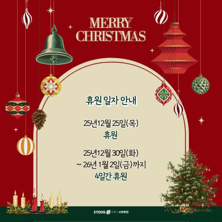 이투스 수학영어학원입니다. [학원 겨울 방학] 공지드립니다. 12월 25일(목) 크리스마스 공휴일로 휴원하며, 12월 30일(화) ~ 26년 1월 2일(금)까지 4일간 학원 겨울 방학으로 휴원합니다. 학원 등원에 착오 없으시길 바랍니다. 휴원 기간 내 학생들의 수업 횟수는 기간 연장 처리됩니다. 감사합니다. -이투스 수학영어학원 드림- 이투스 수학영어학원 망원점에서의 수강 희망 또는 궁금한 사항이 있다면 문의 주세요. [전화 문의] 010-6599-0984 [학원 방문 상담 예약 : 네이버 예약하기] [학원 위치] #수학학원 #영어학원 #수학영어학원 #망원동학원 #입시학원 #내신학원 #망원동종합반 #망원동내신관리 #망원동수학학원 #망원동영어학원 #망원....... <img src="https://phinf.pstatic.net/image.nmv/blog_2025_12_04_3734/YX0IhSnm4S_05.jpg?type=f480x480" />