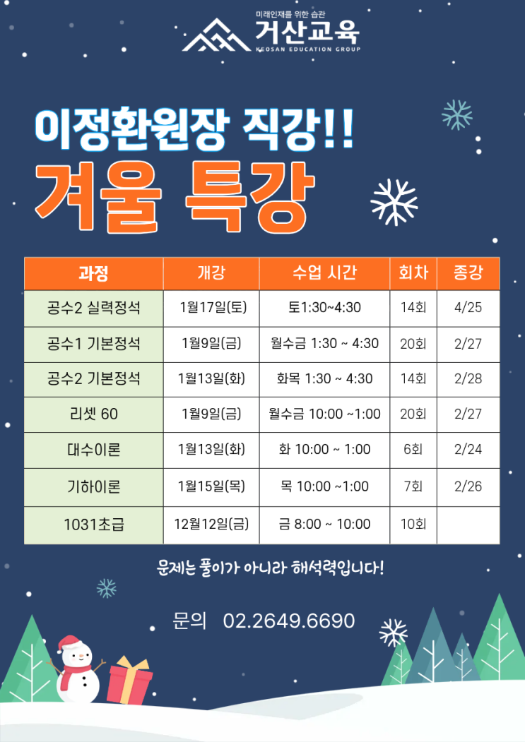 《 특강! 이정환 원장 직강 》 ▣ 이정환 원장 직강! 겨울 학기 특강이 시작됩니다. ▣ 수학은 푸는 힘이 아니라 해석하는 힘입니다. 올바른 해석력! 성적 반전의 결정적 기회! 학생들의 알찬 겨울 방학이 되도록 최선을 다하겠습니다! * 주말에 전화 연결이 어려우시면 문자로 예약해주세요.순차적으로 전화 드리겠습니다 * [수강문의 및 상담예약] ☎ 02 2649-6690 ☎ 010-6809-6690 <img src="https://blogthumb.pstatic.net/MjAyNTEyMDZfMTI0/MDAxNzY1MDAzNzk3NDU4.VeITcR6siRkd_Uydv05i6GrdIk38hnDE8-ALMvlZdJwg.dqf1tn8C-aPh1BxKnBObV5j0iRaYDzT7CMkorFMMng4g.PNG/%BF%F8%C0%E5%B4%D4%B0%DC%BF%EF%C6%AF%B0%AD1.png?type=s3" />