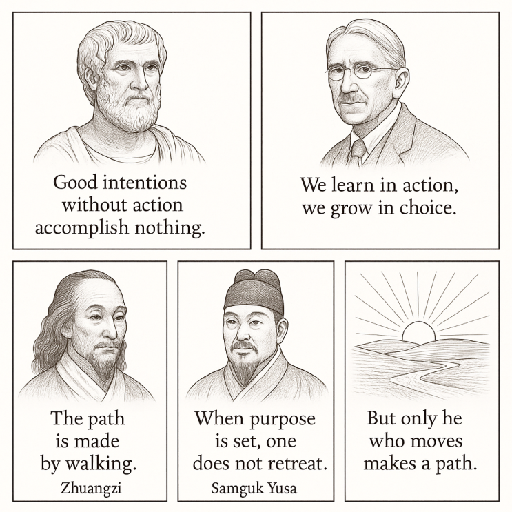 선택은 미래를 향한 약속이며, 행동은 그 약속을 현실로 만드는 힘이다. 아리스토텔레스는 실천을, 파스칼은 책임을, 듀이는 성장의 선택을, 장자는 행위의 창조성을, 삼국유사는 결단의 품격을 말했다. 완벽한 선택은 없다. 그러나 움직이는 자만이 길을 만든다. 1. 아리스토텔레스, 『니코마코스 윤리학』, “행동하지 않는 선의(善意)는 아무 것도 이루지 못한다.” 아리스토텔레스에게 인간의 가치는 ‘생각’이 아니라 실천하는 행위 그 자체다. 아무리 올바른 뜻을 품고 있어도 실행되지 않는다면, 덕은 현실에서 모습을 드러낼 수 없다. <논술·면접 연계> 덕 윤리, 실천의 철학, 행동과 의도 논제에 적합 2. 블레즈 파스칼, 『팡세....... <img src="https://blogthumb.pstatic.net/MjAyNTEyMDlfMTQ0/MDAxNzY1MjYwNDQyMTYx.mLg6KoDuGM1T0Zd_mmIlIQTkv3fNECBsXjKiToFI0j8g.nIUf16lrk-KX0VQzWrwu_NncZE8cQUCuZDr8GzoXWUgg.PNG/ChatGPT_Image_2025%B3%E2_12%BF%F9_9%C0%CF_%BF%C0%C8%C4_03_06_39.png?type=s3" />