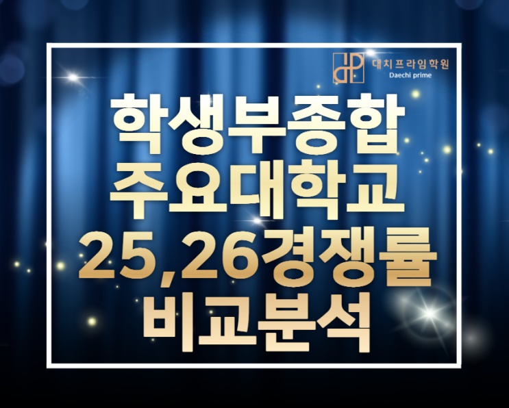 전국수학고사 전국48등 이력 선생님 고려대학교 출신 선생님 등 과목별 실력파 선생님들이 함께하는 #청당동수학학원 #청당동영어학원 #대치프라임 학원입니다 청당동 대치프라임학원은 최근 몇년동안 내신 9등급제 때부터 학원에서 공부하는 모든 고등학교에서 다수의 1등급 학생을 배출하였고 고려대, 연세대, 서강대, 성균관대 합격생 고3 재학생 수능수학(미적분) 1등급 학생을 배출해오고 있습니다 수학 영어 는 물론 입시의 끝까지 함께하는 입시를 가장 잘 아는 #청당동학원 #대치프라임학원 에서 입시정보 공유드립니다 공유드리는 자료는 #수시모집 #학생부종합전형 2025학년도와 2026학년도 서울 수도권 주요대학교의 경쟁률 비교 자료....... <img src="https://blogthumb.pstatic.net/MjAyNjAyMjhfMTM4/MDAxNzcyMjYzNDI2NTE1.MzUwZzkPXcr25gUHUNEnxyMoiVjX-B43yY7upPEqJlMg.J63l9iEj0V8PCzGbjONW_i6YpP_rtz8KWY1cQu84xa0g.PNG/%C1%BE%C7%D50%B4%EB%C7%A5.png?type=s3" />