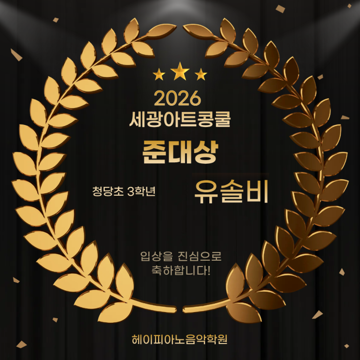 2026 세광아트콩쿨에 나갔던 헤이콩쿨반 친구의 입상을 진심으로 축하합니다! 일정상 다른 콩쿨반 친구들보다 늦게 콩쿨대회에 나가게 되었는데, 긴 시간 동안 준비하느라 수고 많았어~~ 쉽지 않은 곡으로 콩쿨대회를 준비하게 되었는데, 피아노와 음악에 열정이 가득 넘치는 친구이기도 하고, 늘 에너지 넘치고 지친 모습 없이 지도에 잘 따라와줘서 기특하고 고마웠던 학생! 다시 한번 축하해~~ . . . https://www.instagram.com/heypiano_official?igsh=eXZ4dXp3dmJleGVh&utm_source=qr 음악을 쉽고, 즐겁게! 상담.교육 문의 010.5942.3352 <img src="https://blogthumb.pstatic.net/MjAyNjAzMDNfMjUw/MDAxNzcyNTEzMTIwNDc2.4qH_0jPC4ykRLx-fMSRBqu_UDtZ56NJ424zLjJ1IJcQg.czZzc-KXZgAiclqJby-6d6_6ZZdFAbkRL75ZXimuhgsg.PNG/%BC%BC%B1%A4%BE%C6%C6%AE%C4%E1%C4%F0png.png?type=s3" />