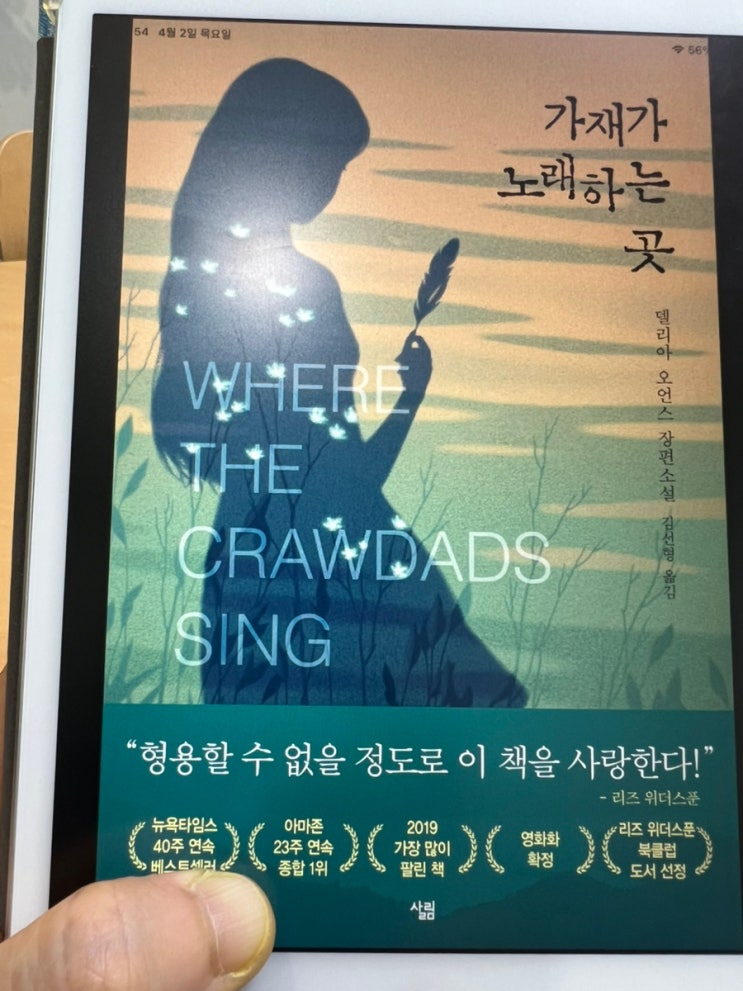2026년책읽기-14-가재가노래하는곳by델리아오언스 여러 요소가 한꺼번에 잘 섞인 소설을 최근작 중에 꼽으라면 이 책을 선뜻 얘기할 것 같다. 습지생태와 야생에 대한 과학자적 시각 뿐만 아니라 시적인 표현까지 어우러져 문장마다 예쁜 이미지가 따라 붙는 것 같다. 게다가 끝까지 궁금증을 놓지 못하게 만드는 스토리 전개도 우수하다. 사회집단이 얼마나 이기적인지를 여실히 보여주며 뛰어난 사회학적 측면도 발휘했다만, 다소…장황하다! 아마도 작가의 첫 소설이기에 그렇지 않은가 싶다. 사랑 이야기보다 누가 범인인가에 더 촛점을 맞춰 읽은 탓에 마지막 반전에 약간 실망했지만 습지를 닮은 카야를 생각한다면 충분히 어울리는(!) 결....... <img src="https://blogthumb.pstatic.net/MjAyNjA0MDJfMjY0/MDAxNzc1MTA3MjExMzE3.GkBLf4TNYH8yba-bHrhYQTTqeqzgz6pWlArmETCxJbAg.CZBQhHwW9Ve8ctjrN_SrWXCb71VeBHyC9I6uMj5bkq0g.JPEG/IMG%A3%DF2427.jpg?type=s3" />