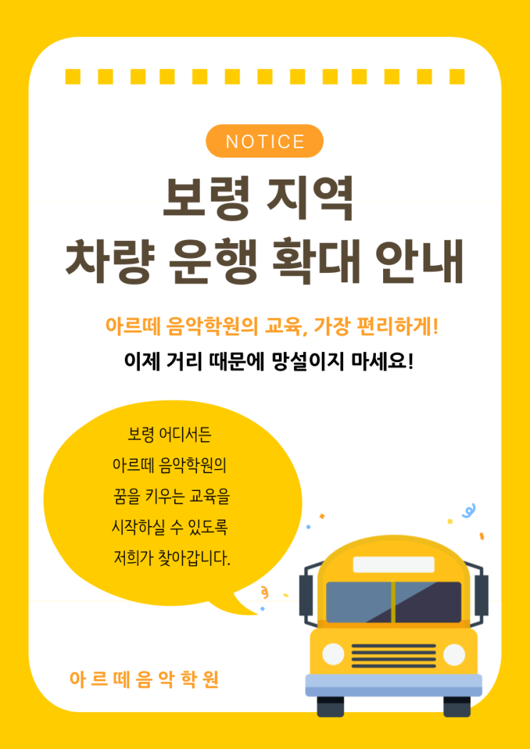 2026학년도 아르떼 음악학원 신입생 모집! 차량 운행 확대 보령 시내권 시골학교 외곽지역 차량운행 가능
