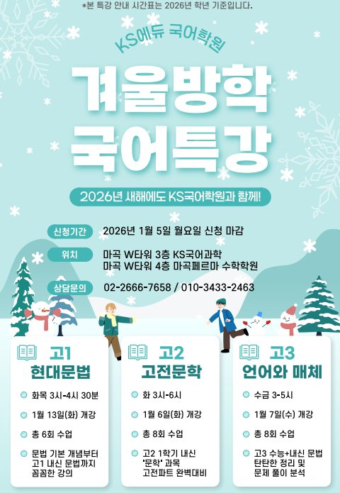 안녕하세요. KS에듀 학원입니다. 겨울 방학 "고등부 국어 특강" 안내드립니다. 이제 고2 올라가는 학생들은 지난 1학년 내신에서 문법(중세국어, 문법요소)과 문학(고전시가/산문)이 대부분 출제되었을텐데요. 중세국어나 고전문학이나 두 영역 모두 옛날 언어들을 해석하는 것이 문제접근의 첫 걸음이기 때문에 '고어'에 대해 대충 생각하고 접근했다면 공부 시작부터 헤맨 학생들이 많았을 것 같습니다. 또, 해당 영역의 특성상 공부를 나름 열심히 했더라도 '문법'이나 '문학'에 대한 기본 베이스가 안 잡혀있었다면 학습에 큰 어려움을 겪었을 것 같아요. 중세국어는 현대 국어문법 개념을 바탕으로....... <img src="https://blogthumb.pstatic.net/MjAyNjAxMDlfNzAg/MDAxNzY3OTQ5NDU5NzE4.8v4Xcof1brC_oPcgzPBLJ6eyD_kvioqN2K4AGFqytpsg.n7OxrfFgFYQ0t5jc_gOQH4OCP0D_gmEgzHcfPT6pFM4g.PNG/image.png?type=s3" />