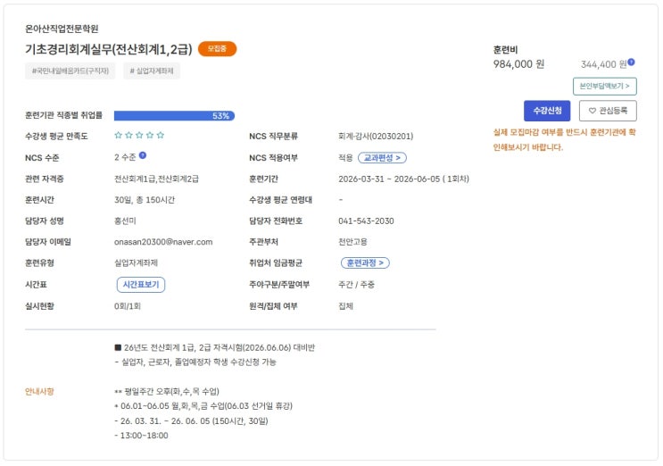 [아산국비학원] 온아산직업전문학원 국비지원 과정 모집 안내: 기초경리회계실무(전산회계 1,2급)
