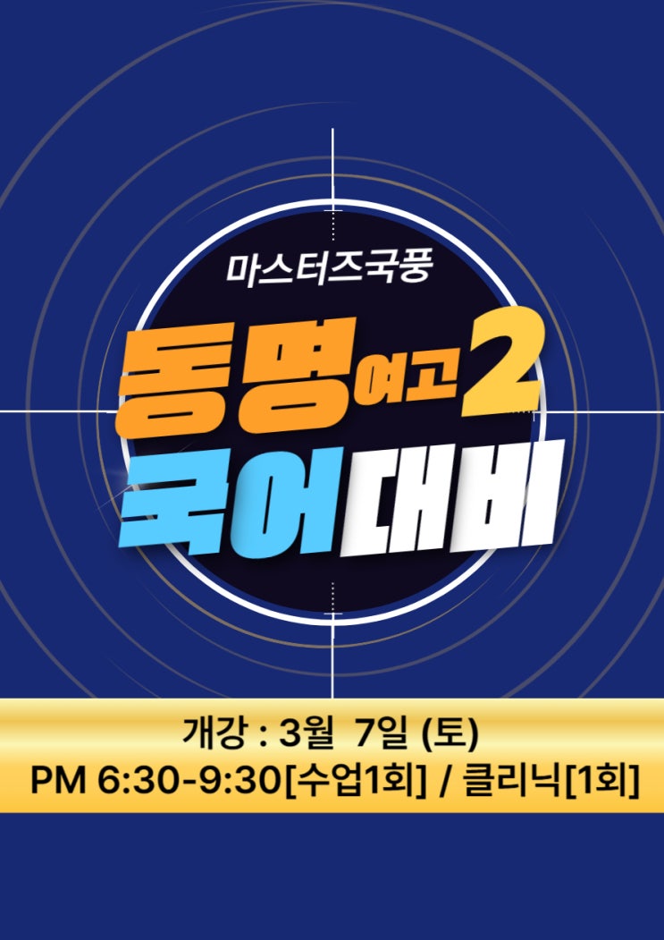 2026학년도 2학년 1학기 동명여고 국어(문학) 내신대비 ◈ 기간 : 3월 7일~ 시험 직전까지 (8주 완성) ◈ 수업시간 : 매주 토요일 오후 6:30-9:30 - 30분 일찍 등원 [3시간 강의 1시간 문제풀이] ◈ 교재 : 학교채택 교과서 + 학원 제작 교재 + 워크북 ◈ 담당 : 원장 직강 + 조교 클리닉 감독 ◈ 수업 내용 : ① 시험 범위 교과서 문학 작품 외 연계 작품 ② 기출 학력평가 전 범위 ③ 학교 채택 부교재 ◈ 수업방식 : 시험 범위 작품 분석 강의 → 기출 분석을 통해 작품의 포인트 공략 → 출제 가능한 연계 작품 분석 → 워크북을 통해 복습 → 출제 예상 문제 풀이(시험 2주 전부터) ◈ 동명여고2는 시험 범위 작품 분량에 따라 수업 시간의....... <img src="https://blogthumb.pstatic.net/MjAyNjAyMjhfMTQ2/MDAxNzcyMjUyNjU5MDYz.Djz2D596TaCG3tZMZ5HpUHsNkc6GNIaCapSq3nSlfPsg.-OiJJGs-DI0_oLS8nGf__7VkoMLP3m-2atohvDZsEKkg.JPEG/010.jpg?type=s3" />