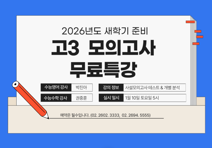 다사다난했던 2025년도가 모두 끝나갑니다. 새로운 출발을 위해 학원에서는 1:1 개별 면담이 진행되고 있습니다. 1:1 개별 면담으로 아이들 스스로 자신의 위치를 자각하고 발전시킬 수 있는 방향을 찾아보는 뜻깊은 시간을 갖을 수 있었습니다. 12월 29일~1월3일까지 잠시 숨고르는 시간을 갖고 2026년 1월 5일부터 스터디플랜의 시간은 다시 시작됩니다!!! <예비 고3 원비안내> 재원중인 예비 고3은 기존 원비대로 청구됩니다. 다만, 두과목 할인 또는 형제할인 적용은 제외됩니다. 겨울학기부터 합류하는 예비고3 원비는 국어 35만원, 영어 37만원입니다. (4주기준 금액입니다.) 새해 복 많이 받으시길 바랍니다!!!! <img src="https://blogthumb.pstatic.net/MjAyNTEyMjZfODIg/MDAxNzY2NzM4NTU2MjAz.s0NDZJ4q98C3pSZiG6w_lhDmUewTlGgMrEyvYHP9vIsg.sVIA_bucJCDczcYVSYP4eCYfFMa6iBqLG8nW0tqLSIIg.JPEG/%BC%F6%B3%B3%BE%C8%B3%BB%C5%E5.jpg?type=s3" />