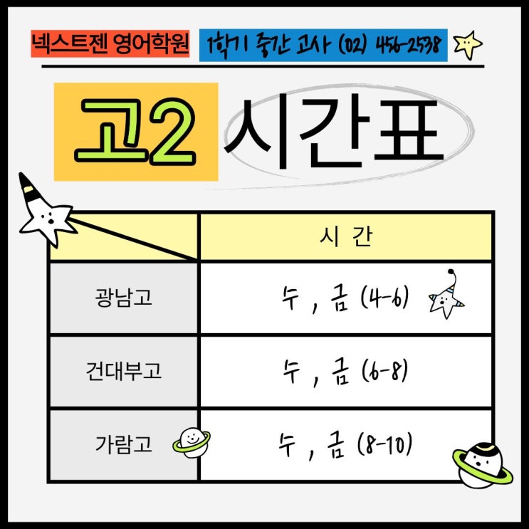 넥스트젠에서 2026년 고등학교2학년 , 학교별1학기 중간고사 대비 시간표를 공지합니다. 완벽한 학교별 내신 분석 강의 넥젠만의 유의어 및 반의어 선택지 어휘 제공 학생별 1:1 첨삭 클리닉 진행 킬러 문항인 서술형 대비 (영작 방법 공부 및 암기 문장 엄선!!) 넥젠에서 확실한 성적향상을 하려는 학생 또는 부모님들은 02) 456 - 2538로 연락 주세요^^ <img src="https://blogthumb.pstatic.net/MjAyNjAzMDJfNjIg/MDAxNzcyNDQxNDAzNjk5.k2sVXm_VQrMxIsLUrpjXSMIf8jnsXqV_Br-LAxCzli8g.I65cuUc3SEfJZODo6PvcJFOkC0OPkCCQCn5muOdp_hog.JPEG/%B0%ED2_%B3%BB%BD%C5_%B4%EB%BA%F1_%BD%C3%B0%A3%C7%A5_%282%29.jpg?type=s3" />