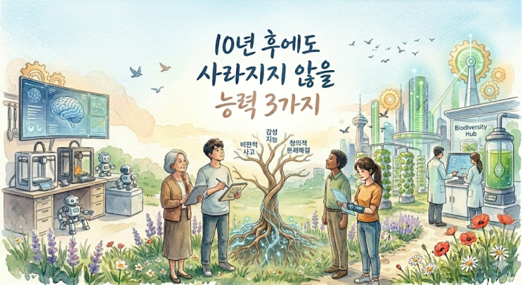 9부 10년 후에도 사라지지 않을 능력 3가지 – 기술은 바뀌어도, 이 능력은 남습니다 AI는 빠르게 발전하고 있습니다. 지식은 더 이상 희소하지 않습니다. 정보는 이미 누구에게나 열려 있습니다. 그렇다면 질문은 이것입니다. 10년 후에도 여전히 경쟁력이 될 능력은 무엇인가? 기술은 바뀝니다. 직업도 바뀝니다. 하지만 ‘능력의 구조’는 쉽게 사라지지 않습니다. ① 문제 정의 능력 (Problem Framing Ability) 앞으로는 정답을 아는 사람이 아니라 문제를 정확히 정의하는 사람이 필요합니다. AI는 답을 빠르게 제시합니다. 하지만 무엇을 물어야 하는가 어디까지를 문제로 설정할 것인가 조건은 무엇인가 이걸 정하는 것은 인간의 몫입니다....... <img src="https://blogthumb.pstatic.net/MjAyNjAzMDFfMzEg/MDAxNzcyMzY4MjA0OTMx.OQQXpHNX_uWES9oy1F1_zNZT0q-zBo55vlHkrTMjcxgg.kWMSKtOM1YutV0msmI6bENLOWXOiNhxD3AqsO9wwGiYg.PNG/image.png?type=s3" />