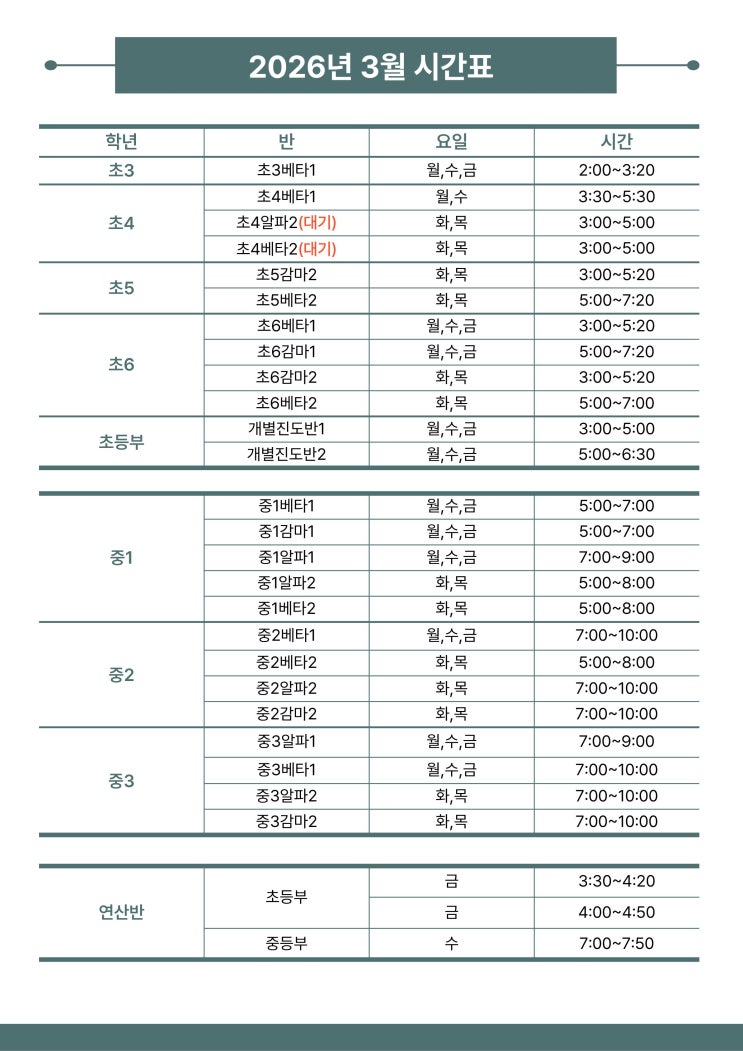26년 3월 수업 시간표 (영등포 당산동 삼성타운 수학의힘 당산)