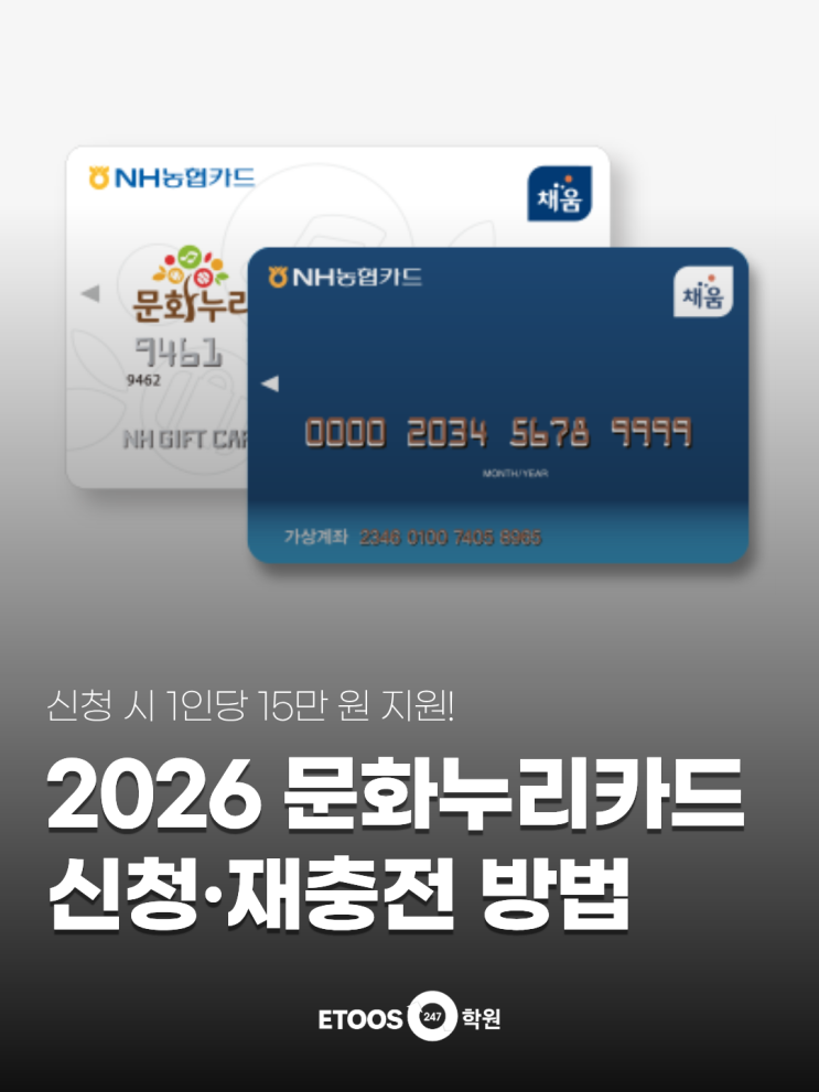 안녕하세요! 이투스247학원 공식 블로그입니다. 오늘은 문화누리카드에 대해 알려드리고자 하는데요! 지원 대상에 한하여 1인당 연간 15만 원 문화비 지원을 받을 수 있는 문화누리카드! 지금 바로 어떤 혜택인지 알아보시죠! 2026 문화누리카드 지원 대상(조건)! '문화누리카드'란 삶의 질 향상과 문화격차 완화를 위해 기초생활수급자·차상위계층을 대상으로 문화예술·관광·체육 활동을 지원하는 카드입니다! 2026년 문화누리카드 신청 시 자격 대상은 6세 이상 기초생활수급자 또는 차상위 계층인데요! 각 조건별 대상자에 대한 자세한 내용은 아래 작은 글씨를 참고해 주시길 바랍니다! *6세 이상(2020. 12. 31 이전 출생자) *기초....... <img src="https://blogthumb.pstatic.net/MjAyNjAyMTFfMTQx/MDAxNzcwNzg5MTE0MzQ3.5EPIzqaOyjIpwVeYk8m0uQOAls3ZV9F6XfHek-bXaEIg.J6gBk-_mEUR_aWo8KY9NcjRW9zuJUbVGNBBcfWO84NQg.PNG/1.png?type=s3" />