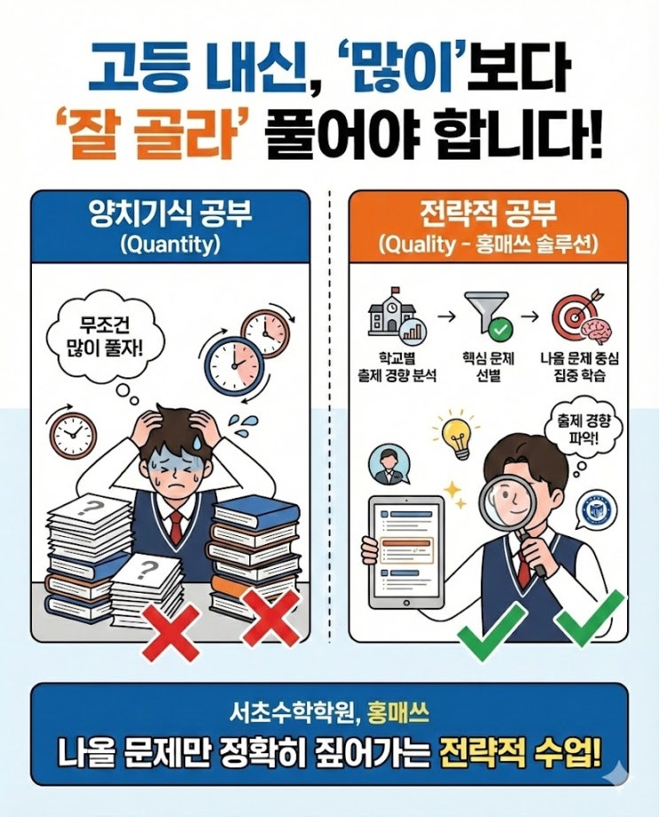 안녕하세요. 본질에 충실하면서도, 철저한 체계 아래 실력을 길러주는 홍매쓰수학학원 서초점입니다. 고등학교 수학 내신은 중학교 때와는 완전히 다른 방식으로 다가옵니다. 범위는 줄어들지만 문제는 더 까다롭고, 기출은 있어도 학교별 유형 차이가 크기 때문에 그냥 ‘열심히 많이 푸는 공부’로는 막막할 수밖에 없습니다. 하지만 그 막막함은 학생이 게으르거나 부족해서가 아니라, 전략 없이 시작했기 때문입니다. 고등 내신은 ‘많이 푸는 것’보다 ‘잘 골라 푸는 것’입니다 내신 시험은 단순 실력 테스트가 아닙니다. 교사의 출제 스타일, 수업 강조 포인트, 학교별 자주 나오는 유형 등 매우 전략적인 요소들이 작용하는 시험이죠. 그....... <img src="https://blogthumb.pstatic.net/MjAyNjAyMDZfMjI2/MDAxNzcwMzQ0MTE4MTkw.PXtQalNEaQw8EgwL5T6cGIxPeAeDV6akXnvIDcDoIzkg.eu6bN8cLKNo0NPZdE121cfSaEN3AadArzrXw-JgEdeMg.JPEG/unnamed.jpg?type=s3" />