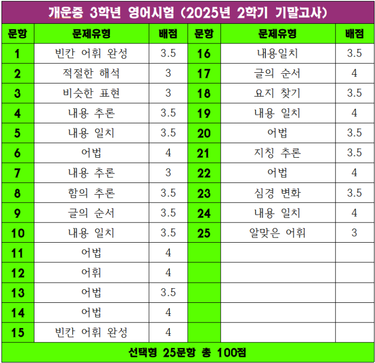 개운중 3학년 영어시험 (2025년 2학기 졸업고사)