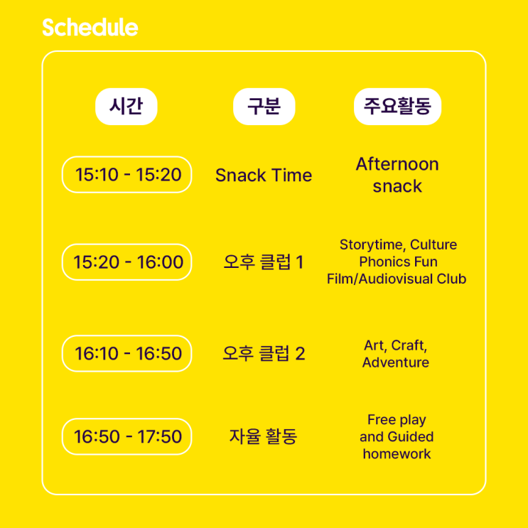 영국문화원Kinder Plus의 특별한 오후 프로그램인 'Afternoon Clubs' 를 소개합니다. 킨더플러스 Afternoon Clubs는 정규 프로그램 이후에도 영어 몰입을 이어가는 오후 확장 프로그램입니다. 활동 중심 수업을 통해 아이들은 영어 자신감과 의사소통 능력, 창의력을 자연스럽게 키워갑니다. Afternoon Club 운영 시간표 아이들의 집중도와 활동 특성을 고려하여 운영되며, 정규 수업 종료 후 맛있는 간식 시간으로 에너지를 충전하며 시작합니다. 매일이 기다려지는 다채로운 과목 소개 요일별로 구성된 흥미로운 테마 활동을 통해 아이들은 지루할 틈 없이 영어의 재미에 푹 빠지게 됩니다. 창의력과 상상력을 키우는 활동....... <img src="https://blogthumb.pstatic.net/MjAyNjAyMjVfMjU2/MDAxNzcxOTkwNzUyNjA2.f46mrxlS_WPUD_tx4TYMiIcRszeSgvPbRddLNzwYMGYg.C9nc3UoTYuG5fAviYQBlgdeCeblZCMEK3oti9ZA9NXIg.PNG/%C1%A6%B8%F1_%BE%F8%C0%BD-3_2.png?type=s3" />