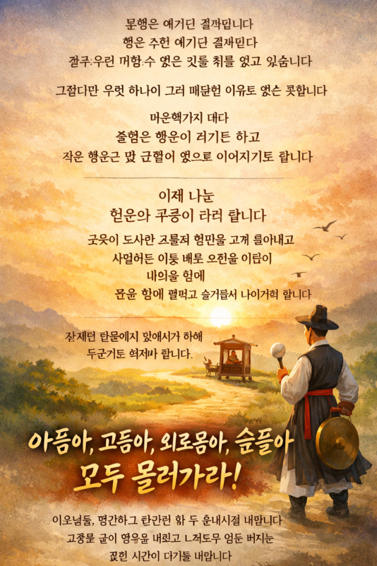 월요일 아침 단상 개나리 벽제소리에 기다리던 온갖 새싹들이 움직인다 고민을 밀어내고 길을 트는 이는 사라지고 초헌만 덩그러니 남았다 알겠다 초헌은 내 것이 아니었고, 봄을 알리는 개나리가 나였다 길을 열어 앞장 서던 그가 다름 아닌 나였다. 어허, 내가 구종이었다. 불행은 예기된 결과입니다 행운 또한 예기된 결과입니다 결국 우리는 피할 수 없는 것들 위를 걷고 있습니다 그렇다면 무엇 하나에 그리 매달릴 이유도 없는 듯합니다 마음먹기에 따라 불행은 행운이 되기도 하고 작은 행운은 몇 곱절의 빛으로 이어지기도 합니다 이제 나는 행운의 구종이 되려 합니다 곳곳에 도사린 고통과 번민을 크게 몰아내고 사랑하는 이를 태운 초....... <img src="https://blogthumb.pstatic.net/MjAyNjAzMzBfMjI2/MDAxNzc0ODI4NDg5ODAy.QnjN7p-Nak_SDtDkn3xOk4FIsMr3mP_8bNmtQteM1Ocg.Na6xFPznOsIOB0YD_UXkNBkvJ88PKXOl6IjAt0GTgMAg.PNG/900%A3%DFfile%A3%DF0000000077b472068f9d036d6c6d18a7.png?type=s3" />