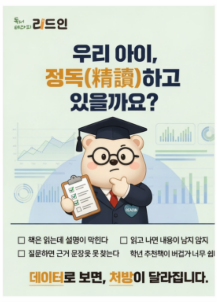 이제 곧 3월, 새 학기를 앞두고 아이 학습에 대해 다시 한 번 생각해 보게 되는 시기입니다. 학년이 올라갈수록 수업은 문제를 푸는 속도보다 읽고 이해하는 힘을 바탕으로 진행됩니다. 그래서 신학기 준비에서 가장 먼저 점검해야 할 것은 문제집이 아니라 아이의 독서력과 독해력이라고 생각합니다. 책은 읽지만 설명하면 막히거나, 읽고 나서 핵심이 잘 남지 않는다면 아이의 현재 독서 수준을 한 번쯤 점검해 볼 필요가 있습니다. 리드인 수업은 초등 1학년부터 중학교 3학년까지, 학년이 아닌 아이의 읽기·이해·정리 능력에 맞춰 진행합니다. 신학기를 앞두고 교과도서 지수 검사를 통해 아이의 읽기 속도와 이해 정도를 살펴보고, 그 결과....... <img src="https://blogthumb.pstatic.net/MjAyNjAyMjBfMTIx/MDAxNzcxNTkyNTg4ODc5.IEvDZgn5ScUnIWKkDjSVtpxtrPL7dlo4LUAald0TVDAg.1vQc5kpALTr8KzlKzZolYu2kRZokwVXYnHKV78Xc2tog.PNG/image.png?type=s3" />