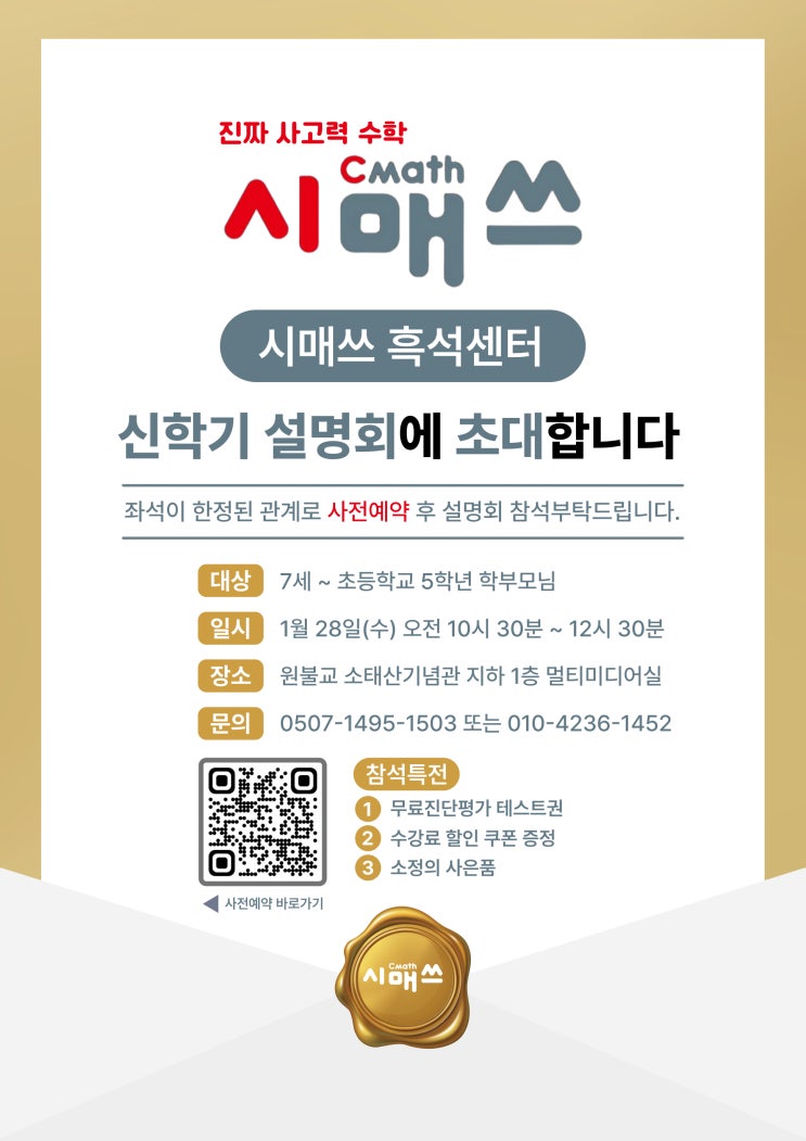 2026년 1월 28일 진짜 사고력 수학 시매쓰 흑석센터에서 신학기 새프로그램 안내와 교육 정보 안내를 위해 신학기 설명회를 진행합니다. 대상: 7세 ~ 초등학교 5학년 학부모님 일시: 1월 28일(수) 오전 10시 30분 ~ 12시 30분 장소: 흑석동 원불교 소태산기념관 지하1층 멀티미디어실 문의는 0507-1495-1503 또는 010-4236-1452 로 부탁드립니다. 설명회는 2부로 진행되며 1부는 독해력과 사고력 수학 관계 및 학년별 수학 로드맵 2부는 2026년 새로 업그레이드 되는 프로그램과 커리큘럼 안내가 있을 예정입니다. 참석하신 학부모님들께는 참석 특전이 주어집니다!!! 1. 무료 진단평가 테스트권 2. 수강료 할인 쿠폰 증정 3. 소정의 사은품 증정....... <img src="https://blogthumb.pstatic.net/MjAyNjAxMDdfMTI2/MDAxNzY3Nzc1OTUzNDE2.uwL8I6KyPhyh9bBIR_vXnt72gSct2W1GRfDQJPKQNvIg.u_SosFNH4fYcfwmCqDDsz-CPj2mb_HZIXy-IxvQbYe8g.JPEG/%BC%B3%B8%ED%C8%B8%BE%C8%B3%BB-001.jpg?type=s3" />