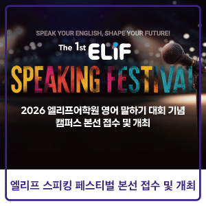 안녕하세요. English Learning in the Future 표현이 자유로운 영어 사고력, 엘리프어학원입니다. 지난 11월 24일부터 시작된 제1회 엘리프 스피킹 페스티벌의 본선 접수가 본격적으로 시작되었습니다. 캠퍼스 예선을 통해 본선에 진출하게 된 엘리프어학원 학생들이 영어로 자신의 생각을 표현하는 또 다른 무대가 될 것인데요. 열심히 준비하고 있는 엘리프어학원들 학생들에 많은 응원을 부탁드립니다! 학생들의 학습 동기를 높이고, 영어 자신감을 한 단계 더 성장시킬 수 있는 ELiF SPEAKING FESTIVAL은 엘리프어학원 재원생들이 참여하는 공식 영어 말하기 대회로, 아이들이 학습한 내용을 실제로 말하며 표현할 수 있는 뜻깊은 무대가 될....... <img src="https://blogthumb.pstatic.net/MjAyNjAxMDdfMjEw/MDAxNzY3NzUxMjE1MzA1.ourXprI5yWPNSlVqbxF9as5jnWBEJdM7B4AJUs16G9Mg.q-_egD4trI_yYa6CHacynvEgie34TO5zCueFSOky5NYg.JPEG/%BF%A4%B8%AE%C7%C1-%BD%E6%B3%D7%C0%CF.jpg?type=s3" />