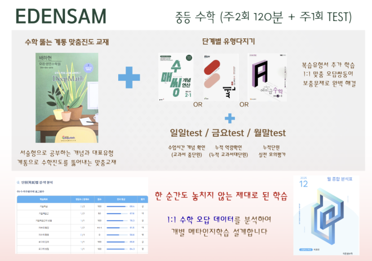 [ 입시전문 이든샘 ] 중등 수학·영어, 철저한 관리와 맞춤형 커리큘럼으로 완전한 실력을 완성합니다! 학부모님들께서 가장 고민하시는 중등 시기, 이든샘만의 체계적인 시스템으로 기초부터 심화까지 완벽하게 1. 중등 수학: 1:1 맞춤 설계로 수학의 '계통'을 뚫다! 이든샘 수학은 단순 암기가 아닌, 개념과 원리를 관통하는 학습을 지향합니다. • 수업 구성: 주 2회(각 120분) 수업 + 주 1회 TEST • 맞춤형 교재 시스템: ◦ 서술형으로 개념을 익히는 'DeepMath' 맞춤 진도 교재를 사용합니다. ◦ 개념 연산부터 에이급 수학까지, 학생 수준에 맞춘 단계별 유형 다지기가 추가 진행됩니다. • 철저한 오답 관리: 1:1 맞....... <img src="https://blogthumb.pstatic.net/MjAyNjAxMDdfMjcx/MDAxNzY3Nzc1NjgyMzg5.eLOONNpHw36H_g3hjySqqvw7TuTp89zscLJoXfjZFeYg.wDxyae9rcIkBwKGiBN_6YAf86hGCHV-2s83rOxhwxlsg.PNG/KakaoTalk_20260105_194230701.png?type=s3" />