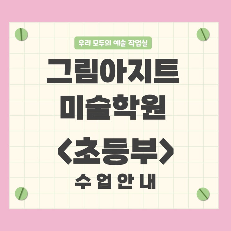 안녕하세요, 학부모님! 그림아지트는 그리기 전문 미술학원으로서 수업 연령은 유치부/ 초등반/ 중고등반 / 입시반 / 성인취미반까지 운영하고 있습니다. 그림에 관심 있는 사람들이라면 누구나! 그림아지트를 자신만의 그리기 놀이터로서 누리고 활용할 수 있답니다.^^ 오늘은 자녀의 미술교육을 고민하시는 초등학생 시기의 학부모님께 그림아지트에서는 초등학생들을 대상으로 어떤 수업이 이루어지는지에 대해 소개해 드리겠습니다. 그림아지트 미술학원 초등부 운영안내 수업 대상 : 8-13세 수업 일정 : 1시간(60분) 내외 주2회-매일반 수업 시간 : 평일 2시-6시 자유롭게 선택 가능 * 차량 미운행 학생 개인별 진도를 나가기 때문에 학생이....... <img src="https://blogthumb.pstatic.net/MjAyNjAyMjZfMjMx/MDAxNzcyMDk2MTAzNjY2.uhcxjfi5kQYimadM-RcgfRc4X5I9SJV-k9RYk_rTPfIg.HVmLKC3DNmhA7OssDT7pyRTA-EVMSlXsQh3rf3oa4AEg.JPEG/%BD%BD%B6%F3%C0%CC%B5%E513.JPG?type=s3" />