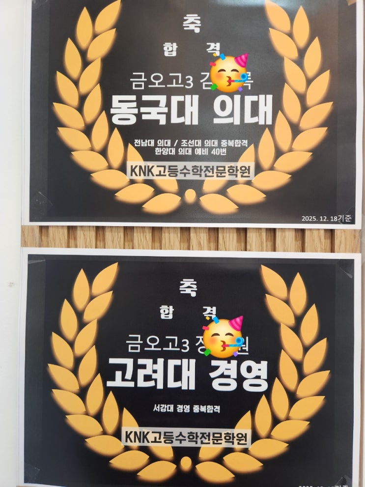 [금오고3 합격 소식] 동국대 의대 · 고려대 경영 합격을 축하합니다 올해도 노력의 결과가 차분히 쌓여 좋은 소식으로 이어졌습니다. 금오고 3학년 학생이 ✔ 동국대학교 의과대학 합격 ✔ 고려대학교 경영학과 합격이라는 의미 있는 결과를 만들어냈습니다. 의대라는 최상위 목표뿐 아니라 상위권 대학 경영학과까지 함께 준비해 폭넓은 선택지를 확보한 사례입니다. 특히 이 학생은 단기간 성과보다는 개념의 정확도 풀이 과정의 완성도 고3까지 흔들리지 않는 학습 루틴을 끝까지 유지해 왔습니다. 저희 KNK고등수학전문학원은 “잘하는 학생만 모으는 학원”이 아니라 성실하게 과정을 버틴 학생이 결과로 증명하는 학원입니....... <img src="https://blogthumb.pstatic.net/MjAyNTEyMzBfMjAw/MDAxNzY3MDk4MDk3MTg2.WVFTpPWwC3hKzsGOOVxCNNMP-GdaephWGNa_A3m7Sr0g.VeZQ3bOFN7B52x-V2gT0i3B_2ymy3SGHdCR0vi7a3f0g.JPEG/900%A3%DF20251222%A3%DF151105.jpg?type=s3" />