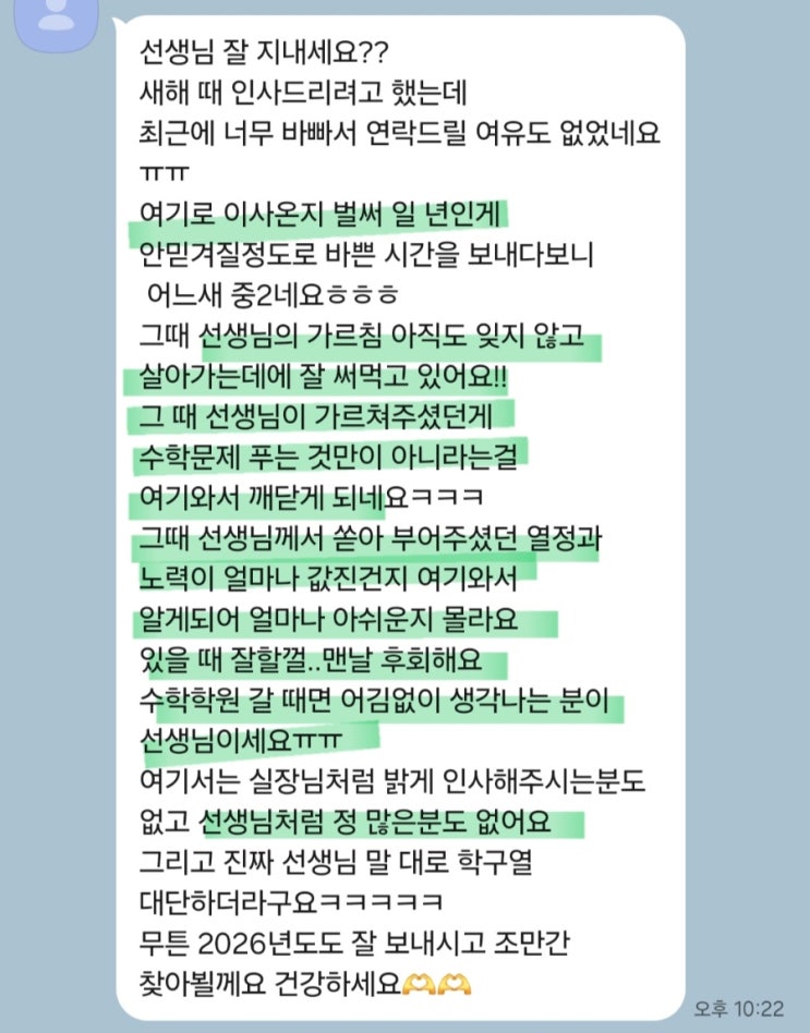 안녕하세요 인수학 수학선생님입니다 학군지로 이사간 학생들이 또는 대학에 입학한학생들이 사회생활을 경험한후에 보내오는 톡메세지들을 읽을때면 매일 아이들이 제 맘처럼 않따라줘서 힘든날이 많은데 그래도 내가 잘가르치고있구나 한번더 힘을내보자 라고 제자신에게 위로를하곤하네요 수학선생님이지만 항상 수학문제풀이만이 아닌 학습을포함한 모는일에 임하는자세와마인드를 알려주고자 지도하고있는데 제가 가르친게 수학문제푸는것만이 아니었다라는것을 학군지를 가서 깨달았다는말 선생님이 쏟아부었던 노력과 열정이 얼마나값진거였는지 학군지에가서 깨달았다는말 제 진심이 닿은거같아 보람을 느낍니다 정말 힘이납니다 <img src="https://blogthumb.pstatic.net/MjAyNjAxMTNfMTA4/MDAxNzY4MzExMzYzOTMz.t5ReEIGLpzkM0hZHe_SNFZQCKh2KYSsUTOcoXLDfoeQg.Z9ukC7FLfSGe0o5YMwPKzbwsRoVyOb67NqbiaVtAJz4g.JPEG/900%A3%DFScreenshot%A3%DF20260113%A3%DF222433%A3%DFKakaoTalk.jpg?type=s3" />