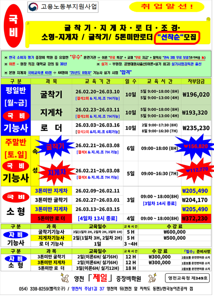 2월, 중장비 전문가의 꿈을 시작하세요! 새해의 첫 시작인 2월, 영천제일중장비학원에서 중장비 운전 기능사 자격증 취득을 위한 교육 과정을 진행합니다. 저렴한 수강료로 부담 없이 전문 기술을 익히고, 안전하고 체계적인 실습 훈련을 통해 여러분의 꿈에 한 발짝 다가가실 수 있습니다. ✔️ 정확한 훈련 일정 및 모집 기간은 언제든 학원으로 문의해 주세요. 친절하고 신속하게 안내해 드립니다. ✔️ 고3 수험생, 대학생, 직장인 등 중장비 전문가를 꿈꾸는 모든 분들을 환영합니다. ✔️ 국비지원 과정도 마련되어 있어 수강료 부담을 크게 줄일 수 있습니다. (세부 조건은 학원 문의) ✨ 영천제일중장비학원을 선택해야 하는 이유 체....... <img src="https://blogthumb.pstatic.net/MjAyNjAyMTBfMTkz/MDAxNzcwNzMyOTAzMTg0.PPvxEn_eBS_YiSwx4hnE21G3fJeCdNPx5jZ4hJXjrOUg.Ir9uEyHRWgSyBJ6qJ0wfokamxeQa4SbBkkFQLHSATZEg.PNG/image.png?type=s3" />