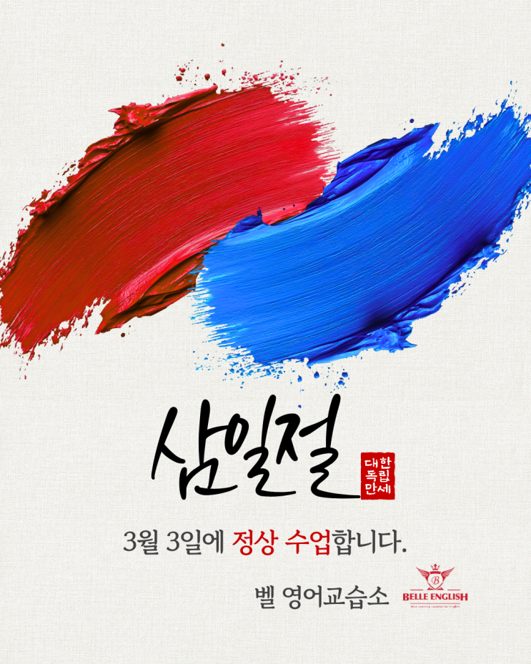 안녕하세요! 영어 배우기 가장 좋은 곳 BEst Learning Location for English 벨 영어입니다. 3월 1일인 삼일절은 순국 선열들께서 나라와 민족의 자유와 독립을 위해 만세를 외쳤던 뜻 깊은 날입니다. 삼일절을 맞이하여 우리 아이들이 가정에서 자유,역사,가치를 함께 이야기 나누는 시간을 가져보기를 바랍니다 이에 벨 영어에서는 삼일절은 휴원을 하고자 합니다. 3월 3일 화요일에 등원하여 정상 수업 하겠습니다. 벨 영어 친구들도 바르고 경건한 마음으로 의미있는 시간을 보내고 오세요. 자유를 위한 고귀한 희생에 Belle이 Very 감사합니다. #상주영어 #벨영어 #상주여중 #남산중 #상주중 #상영초 #상산초 #성동초 #청리초 #낙운중 #상주....... <img src="https://blogthumb.pstatic.net/MjAyNjAyMjhfMjk4/MDAxNzcyMjA2NTQzMTc3.T7x-f9sQD6QhJbAT59GTWgtEhd5jYDJECquolfUKB5og.Ps4_2bGMO32GN4XyMJPSCWYSPnVw4dYIPwo30sCkhbcg.PNG/2026%B3%E231%C0%FD.png?type=s3" />