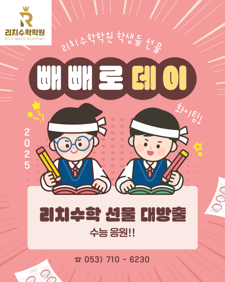 안녕하세요 경산 사동 초등부터 중등 고등까지 사고력,내신,수능,심화,선행 모든 수학은 리치수학국어학원에서!! 수능주간입니다 긴장될 수밖에 없죠? 그래서 저희는 공부 지원은 물론 컨디션,멘탈,관리 삼박자를 챙겼습니다 작은 선물 하나가 버티는 힘이 될텐데요 수능 선물 및 빼빼로 데이 행사로 선물을 학생들에게 직접 준비해서 전달합니다 수능 선물 수능 선물로 매년 스타벅스 텀블러를 전달합니다 학생들이 너무 좋아하겠죠? 수능 시험을 치러 갈때 들고 갈 수도 있고 시험이 끝나도 계속 사용할 수 있어요!! 빼빼로 데이 행사 빼빼로 데이 행사로 마트를 쓸어 담았습니다 사실... 남으면 제가 먹을건데 전 아몬드 빼빼로를 좋아해서 아....... <img src="https://blogthumb.pstatic.net/MjAyNTExMThfMzAw/MDAxNzYzNDAwNTA3NDY0.jZ-uOhZJjlEk0v8FSrsMrcep6LjgPsrjg9hllTk6i2sg.CGC2h_BV5WpSHr_-BPHnZ-qPbKiyxit2Q-JjrUn6zW0g.PNG/%BB%E7%B5%BF%BC%F6%C7%D0%C7%D0%BF%F8_%BB%A9%BB%A9%B7%CE%B5%A5%C0%CC_%BC%F6%B4%C9%BC%B1%B9%B0_%C7%A5%C1%F6.png?type=s3" />