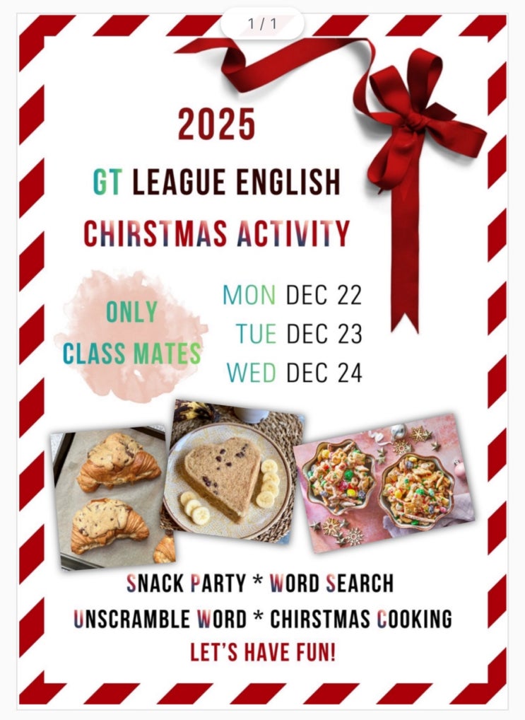 영어 책 읽으며 영어를 친구들과 재미있게 배우는 GT리그영어!!! 이번에 친구들과 무슨 게임과 요리를 할까 고민하다 준비했습니다! 영어가 외국어여서 모르는 것고 많고 이거 왜 공부하나 학생들이 그런 생각 들 수도 있어요~~!! 하지만! 영어공부 하며 즐겁고 재미있는 영어책 독후활동, Cooking도 하면 즐거운 경험으로 영어를 친구랑 함께 하는 거죠! 노는 거 아니고! 단어와 문장 읽고 쓰고 말하기도 하는 건 물론이고요! 즐거운 경험으로 나 영어 배우는 거 즐거워! 그래서 힘든게 있어도 계속 잘 할거야! 이런 원동력이 생긴답니다! Cookie Croissant Cooking on Christmas Day! 초등학생들은 Cooking! 중고등 학생들은 Snack Party! 흠 생....... <img src="https://blogthumb.pstatic.net/MjAyNTEyMDhfMTY2/MDAxNzY1MjA1MjcxOTEy.50e97tjJSyZcgIKV79CMfIOUMarL2hMKbUVXRmBJQkYg.CRggY4zsQnfkUpyjL4XlZftS17R8xlJjAeheTbvc_aQg.JPEG/IMG%A3%DF9050.jpg?type=s3" />