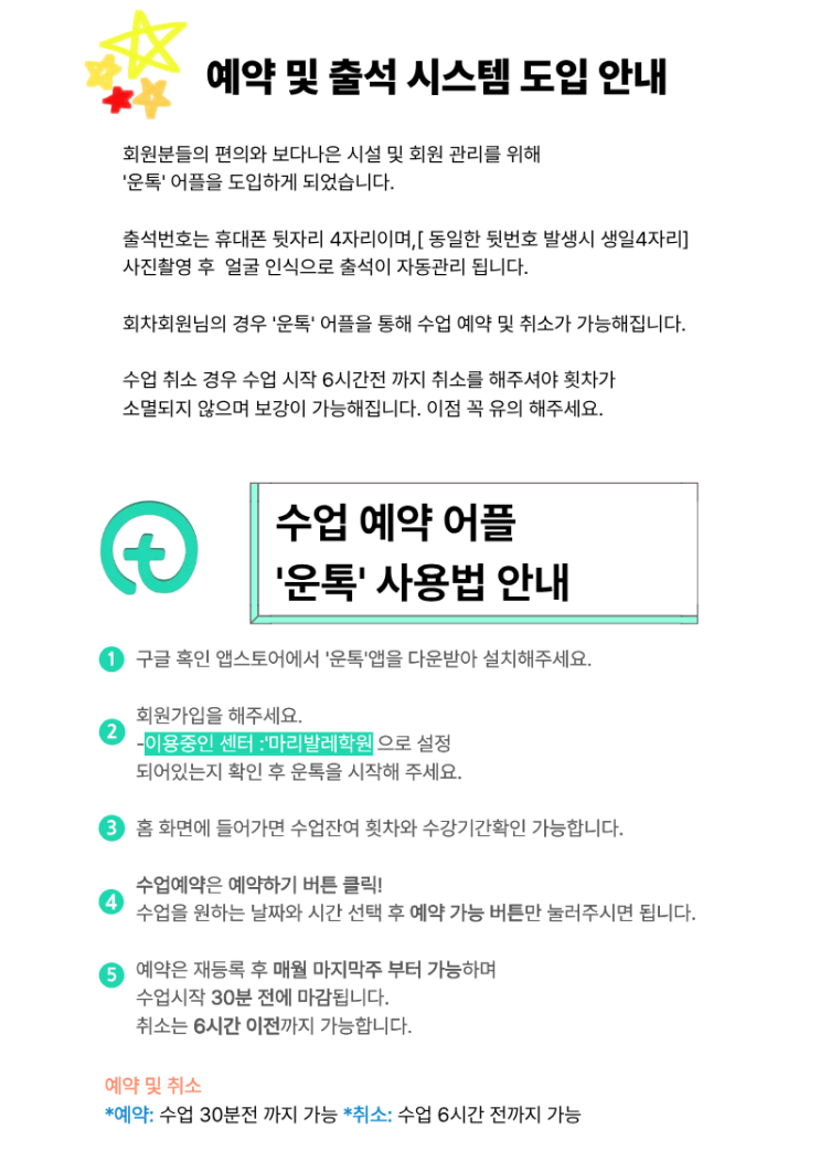 유의사항 - 주 1회시 횟차 등록만 가능 합니다. - 월 등록시(고정 주2회 이상) 수업은 자동으로 셋팅되기 때문에 결석시 수업 시작 전에 미리 말씀해주지 않으시면 횟차가 소멸되어 보강이 안됩니다. 이점 유의 하여 주시기 바랍니다. 꼭 1시간 전까지 말씀해주세요. [ 이미 소멸된 횟차는 복구안됨] -학원 키오스크 패드를 통해 얼굴인식으로 출결 시스템을 시행합니다. 담당 레슨 선생님을 통해 페이스 등록 부탁드립니다. [여러분만 보니 부끄러워 하지 않으셔도 됩니다. > ㅁ <] <img src="https://blogthumb.pstatic.net/MjAyNTExMjFfMjAx/MDAxNzYzNzIyMDM1MDc3.BfU7wyvnhKby2TCIYvXeAL0gARTX8BU9SP5r_--dBRkg.dvPFqYQqTkElojnIZtXYSKcVhB-vuPB-3rf73go-ZXMg.PNG/%C1%A6%B8%F1%C0%BB_%C0%D4%B7%C2%C7%D8%C1%D6%BC%BC%BF%E4..png?type=s3" />