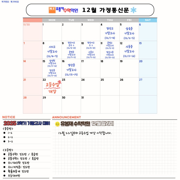 날이 많이 추워졌네요 겨울은 옷 입는 재미가 있는 것 같아요! 예쁘게 입는 것도 좋지만, 감기 걸리지 않게 따뜻하게 입고 다니셔요 M4U의 12월 시간표 공유해드려요! 학생들 기말고사로 바쁜 시기입니다 자세한 내용은 휴대전화로 문의주세요! 문의: 010-5215-7618 #수학 #수학학원 #고등수학 #경산수학학원 #대구수학학원 #경산학원 #중간고사 #기말고사 #내신대비 #수학내신 #경산수학 #대구수학 #시지수학 #시지동수학학원 #초등수학 #중등수학 #계통수학 #유봉재수학학원 #펜타힐즈학원 #펜타힐즈 <img src="https://blogthumb.pstatic.net/MjAyNTEyMDFfMTIy/MDAxNzY0NTk5MDQ5NDE1.XCnvSx0wM-7Rf-N9NNG39khDSAa1zdYRTeAh2D4TMisg.yBNV_2x-a_n4Jtsfx-Po0yDCL75fZ3R-1mPh3QS22kwg.JPEG/%C1%A6%B8%F1%C0%BB-%C0%D4%B7%C2%C7%D8%C1%D6%BC%BC%BF%E4__%BA%B9%BB%E7%BA%BB-_1_-001.jpg?type=s3" />