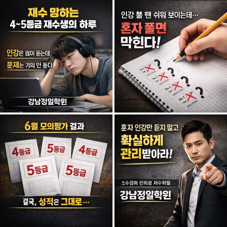“인강만 열심히 들었는데 왜 성적이 그대로일까요?”재수 시작할 때 4~5등급 학생들이 가장 많이 하는 선택이 있다. “일단 인강 패스부터 끊자.” 메가패스, 대성패스. ebs는 구리다고 잘 안 본다. 유명 강사 커리큘럼을 정리한다. 국어 ○○쌤 수학 ○○쌤 영어 ○○쌤 탐구 ○○쌤 그리고 매달 콘텐츠 비용은 할부금처럼 나간다. 그리고 생각한다. “재수하면 최소 2등급은 나오겠지.” 하지만 현실은 다르다. 재수생의 현실적인 자습 시간 아침 자습. 노트북을 켠다. 인강을 틀어 놓는다. 처음에는 열심히 듣는다. 하지만 20~30분 지나면 집중이 흐려진다. 그래도 스스로 위로한다. “오늘 인강 5개 들었네. 나 공부 많이 했다.” 하지만 정....... <img src="https://blogthumb.pstatic.net/MjAyNjAzMDhfMTAw/MDAxNzcyOTU1MjY0OTY4.HEqwuhVJ2axvp_D_qJciAmG-i6B4o1m8JrKhA7J4AMgg.5_semCC-lWTFAYap1_lIwIjbcQ3FoQZcI_b0H65w-8wg.JPEG/KakaoTalk_20260308_143849856.jpg?type=s3" />