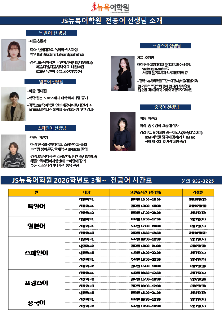 2026 JS 전공어(제2외국어) 3월 시간표 특급교수진 & 수업시간 (프랑스어, 스페인어, 독일어, 일본어, 중국어 in 중계동)