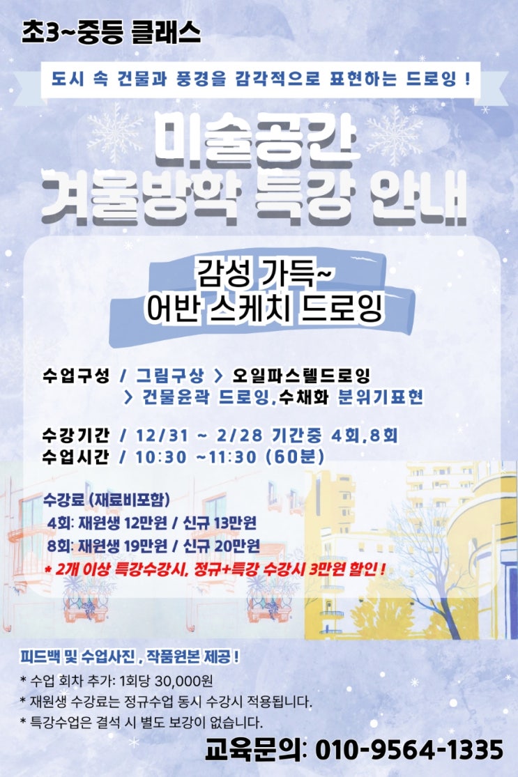 사당5동 남성역 미술공간에서 겨울방학 동안 아이들의 창의력과 집중력을 키워줄 겨울방학 미술특강을 준비했습니다. 초등·중등 학생들을 위한 맞춤 프로그램으로 나만의 이야기책 캘린더/ 어반스케치 /대형 아크릴화/ 수업합니다! 아이들이 직접 표현하고 완성하며 성취감을 느낄 수 있도록 단계별로 지도합니다! 많은 관심 부탁드려요~ 아이들에게 예술로 채워보는 따뜻한 겨울을 선물하세요! 방학 동안 의미 있고 즐거운 시간을 보낼 미술 수업을 찾고 계신다면 편하게 문의 주세요 :) 교육상담: 010 9564 1335 / 부재시 문자 남겨 주세요:) <img src="https://blogthumb.pstatic.net/MjAyNTExMjhfMjQx/MDAxNzY0MzI3MjQ5MTc3.WkEPHRlBlcd2iNDqXxoXqampiP4fvrBN4qsPfNxfg38g.RIquFOOF44DoAppo3xPRtTwEjK5KOXVx9WB38QQgl0gg.JPEG/900%A3%DF1764326722103.jpg?type=s3" />