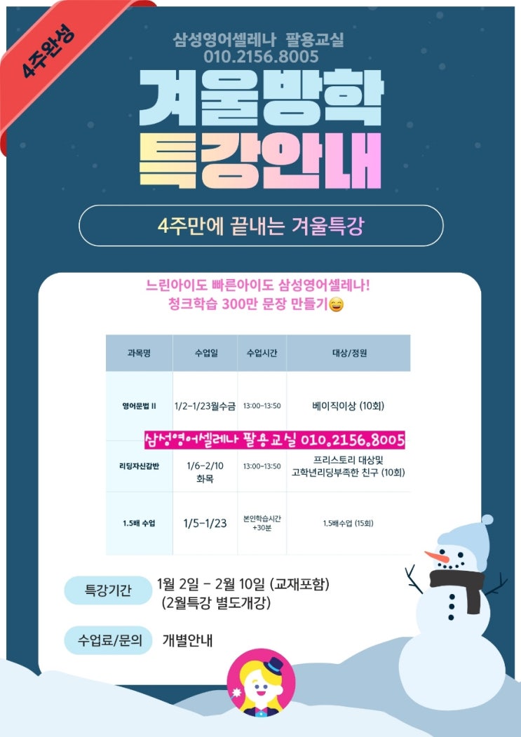팔용동영어 중등대비, 4주완성 삼성영어셀레나 팔용교실 겨울방학 특강안내