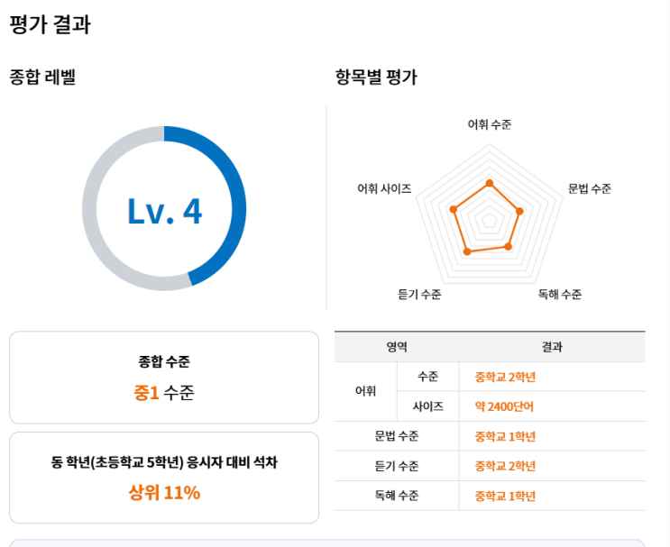 올리브트리영어학원 5학년 부터의 프로그램<하이 클래스>는 레벨별 원서 정독 수업은 그대로 가져가되 어휘와 독해와 문법을 더욱 강화 하기 위한 훈련의 시간이 추가가 됩니다. 1년간 하이클래스에서 <어휘>, <독해훈련>, <문법>을 꾸준히 한 한생들의 결과를 보여드립니다. 초5학년 여자친구 H 작년 12월 부터 시작한 하이클래스 수업 이제 일년 이 되어가는 시점에서 그동안의 기록을 공개합니다. 처음 Nelt시험에 응시 했을 때 대비석차가 72%로 하위권이었던 친구가 이번 달에는 상위 11%를 달성했습니다. 꾸준한 어휘학습을 통해서 어느순간 대폭 성장하는 모습이 보이네요. 초5 이제 어휘는 중2수준으로 상위 5% ....... <img src="https://blogthumb.pstatic.net/MjAyNTEyMDdfMTgy/MDAxNzY1MDk1MTU0MTE4.M2ch6nFMxHfy9v3dAcySujGPJv6r0_OOTK2Apjke3Ygg.gr0ljme5DqXTfCOlzmRPRXoXthiYZ1uxpDixkBraQBIg.PNG/%BD%BA%C5%A9%B8%B0%BC%A6_2025-12-07_165812.png?type=s3" />