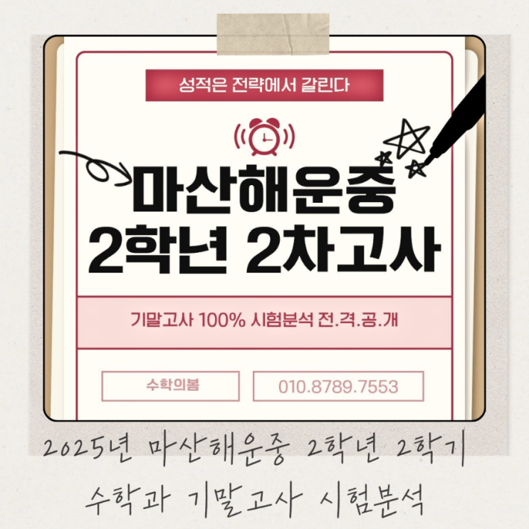 2025년 마산해운중 2학년 2학기 수학과 기말고사 시험분석 안녕하세요 마산수학 수봄쌤입니다. 2026년이 되었네요. 새해는 보셨나요? 올한해도 하는일 모두 잘 되길 바랍니다. 오늘은 2025년 마산해운중 2학년 2학기 수학과 2차고사인 기말고사 분석을 해보겠습니다. 출제유형은 어떠했는지, 이번 시험범위는 어디였는지 꼭 확인해 보시길 추천드립니다. 마산해운중 2학년 2학기 기말고사 수학 시험범위 I. 도형의 성질 01. 삼각형의 성질 02. 사각형의 성질 II. 도형의 닮음 01. 도형의 닮음 마산해운중 2학년 2학기 수학 기말고사 시험분석 마산해운중 시험날짜는 12월 8일 (월) ~ 12월 10일 (수) 3일간 진행되었고 수학시험은 12월 10일 수요....... <img src="https://blogthumb.pstatic.net/MjAyNjAxMDJfMjI3/MDAxNzY3MzE5MzY3ODQ4.FuFw5jF5mnc8OPyqfSpSTXQbHDp9OB_xhvy7l7uk09Ig.tf9SdMzSjSTVeKNrg_kz2fZovg-gHfqdyKkIP92R94Mg.PNG/900%A3%DF%BA%A3%C0%CC%C1%F6_%BD%C9%C7%C3%C7%D1_%C8%DE%B0%A1_%BE%C8%B3%BB_%B0%F8%C1%F6_%C0%CE%BD%BA%C5%B8%B1%D7%B7%A5_%C7%C7%B5%E5%A3%DF20260102%A3%DF110208%A3%DF0000.png?type=s3" />
