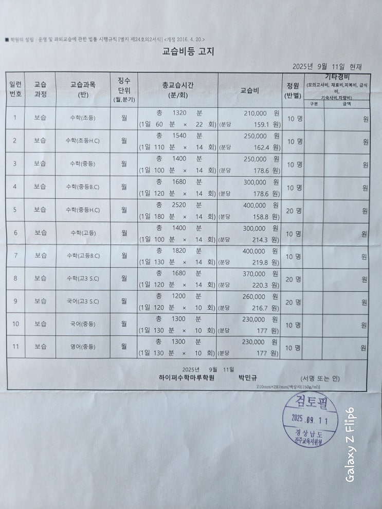 하이퍼 수학마루 학원의 교습비 안내~!