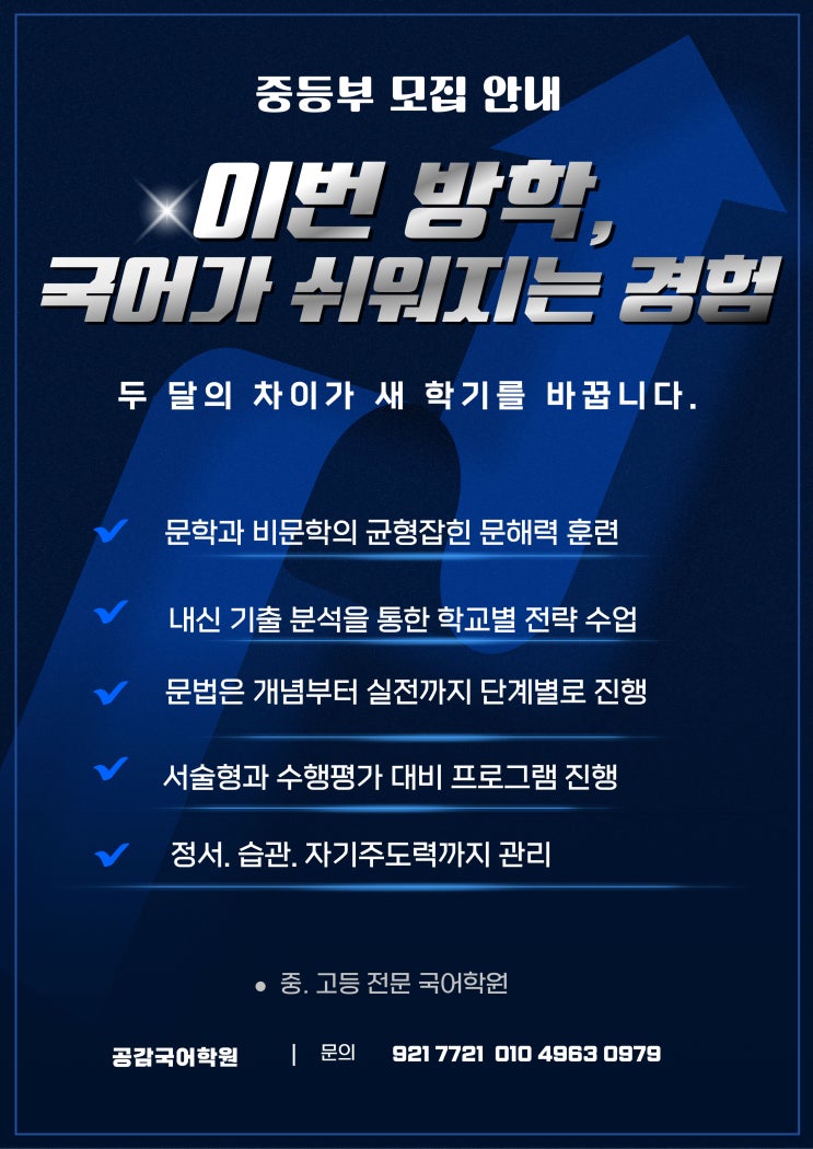 이번 방학, 국어가 쉬워지는 경험 두 달의 차이가 새 학기를 바꿉니다. 중학교에 들어가면서 많은 학생들이 국어에서 처음으로 벽을 느낍니다. 지문은 길어지고, 문제는 복합적으로 바뀌며, 단순 암기나 감각으로는 더 이상 해결되지 않습니다. 그래서 중등 국어는 ‘언제 시작하느냐’가 가장 중요합니다. 이번 방학, 공감국어학원 중등부에서는 국어의 구조를 이해하고, 스스로 풀 수 있는 힘을 기르는 수업을 준비했습니다. 왜 중등 국어는 ‘방학’이 중요한가요? 중등 국어는 초등 국어와 전혀 다릅니다. ✔ 문학과 비문학의 비중이 본격적으로 커지고 ✔ 학교별 내신 출제 경향 차이가 뚜렷해지며 ✔ 서술형·수행평가가 성적을 좌우하....... <img src="https://blogthumb.pstatic.net/MjAyNjAxMTJfMjM0/MDAxNzY4MjE0OTcyNDA1.uIo0vILvZSIpXHX97O3npWBR68qnqnIYDZBRl9z68pYg.GevTGWopiDkbArYcU7MO0t7xl9tJEaJuZuJadLm3oUkg.JPEG/%B1%B9%BE%EE%B0%A1_%BD%AC%BF%F6%C1%F6%B4%C2_%B0%E6%C7%E8.jpg?type=s3" />
