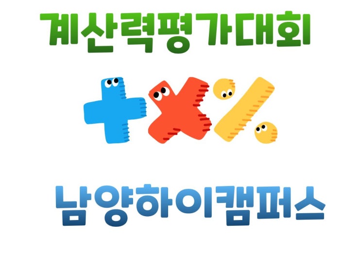 안녕하세요, 남양하이캠퍼스 입니다. 슬기로운 공부습관을 아이들에게 심어주기 위해 열심히 노력하고 있습니다. 수학의 중요성은 말할 필요없이 중요합니다. 그래서 26년 2월7일에 회원들을 대상으로 "수학 계산력평가대회'를 준비하고 있습니다. 계산력 평가 대회? 우리아이들의 수학 실력을 좌우하는건 연산력!! 계산력평가를 통해서 학력에 맞는 수학을 완성할수 있어요 각 센터나 학원에서 예선전을 거쳐 우수한 성적을 거둔 대표학생들은 3월에 있을 본선대회에 출전하게 됩니다. *참가대상: 눈높이 회원 *접수기간: 1월30일(금) *본 선 : 3월 초 접수 많이 해주세요!! 우리친구들에게 많은 응원과 격려부탁드립니다.^^ 궁금하신....... <img src="https://blogthumb.pstatic.net/MjAyNjAxMTJfMjM5/MDAxNzY4MTk4MDcyMDIy.qMXPraD4Eu2u4mB3WBqiVpmzDXRfMjtAxmJRisTQsysg.oTnqe30HQ_86q-ls5comSnv4yWfXOov_xH4NBkf-8R0g.JPEG/%C1%A6%B8%F1%C0%BB_%C0%D4%B7%C2%C7%D8%C1%D6%BC%BC%BF%E4._%288%29.jpg?type=s3" />
