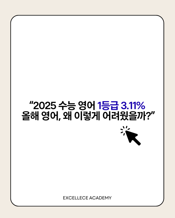1. 기사 핵심 요약 ■ 2025 수능 영어 1등급 비율 3.11% 한국교육과정평가원 발표 기준. 최근 5년 중 가장 낮은 수치로, ‘상대적으로 어려웠던 영어 영역'으로 평가됨. 고난도 빈칸·어휘·추론 문제의 체감 난도가 상승. 준킬러를 포함한 전반 난이도 조절로 상위권 변별력 강화. 학교 내신과 달리, 수능은 문법·구문·해석 능력의 기반이 없는 학생은 고득점이 어려움. ■ 전문가 분석 “읽기 속도만 빠른 학생보다 정확한 문법·구문 해석력이 있는 학생이 유리했다.” (교육평가 분야 보고서 인용 요약) “매년 난이도 예측 불가. 실전은 결국 ‘근본기’ 싸움.” → 정확한 문법 개념 + 구조적 독해력, 이 두 가지가 올해 완전히 당락을 갈....... <img src="https://blogthumb.pstatic.net/MjAyNTEyMTBfMTgw/MDAxNzY1MzQyMjU5NjM4.AdIogO7lI9H9PlWi0k_i-uRNTnAEmm3aCxu9g_VFcaYg.mpcWPkhJKTKItAS9I_veffIfvtqXCoLZ4QjmByKnUsAg.PNG/1.png?type=s3" />