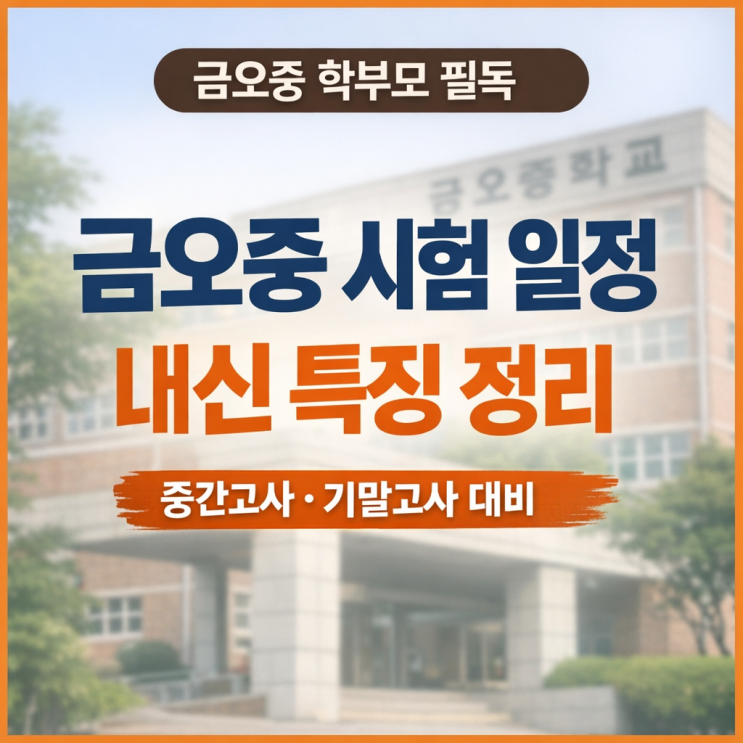 안녕하세요. KSE영수학원 대표원장 이종훈입니다. 금오중학교 학부모님들과 상담을 하다 보면 자주 듣는 질문이 있습니다. “금오중 중간고사는 언제인가요?” “금오중 기말고사는 언제부터 준비해야 하나요?” “금오중 수학시험은 다른 학교와 비교해 어려운 편인가요?” 이런 질문은 아주 자연스럽습니다. 중학교 내신은 초등학교 평가와 달리 시험 범위가 넓고, 서술형 비중도 높으며, 시험 한 번의 결과가 학생의 자신감에 큰 영향을 주기 때문입니다. 특히 금오중학교 시험 일정은 단순히 날짜만 확인하면 되는 정보가 아닙니다. 금오중 중간고사와 금오중 기말고사가 언제 시행되는지 아는 것도 중요하지만, 그 시험이 어떤 방향으로 출....... <img src="https://blogthumb.pstatic.net/MjAyNjAzMTBfNDEg/MDAxNzczMDgwNTAxODYx.z8fltiouh1VQAJuVd0dTt504SjpVdT_TaSTqnFbGq9Yg.gt0_WGeXQ6BIAcydegYciP_yOJ6NTUMRRiWCl7Sz0G0g.PNG/%B1%DD%BF%C0%C1%DF_%BD%C3%C7%E8_%BE%C8%B3%BB.png?type=s3" />