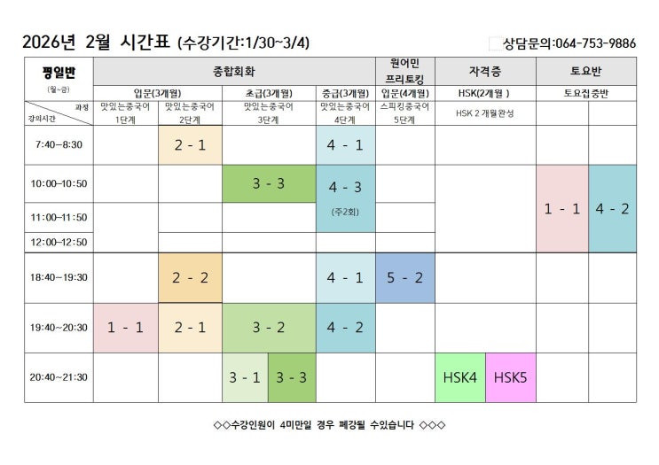 (제주시중국어학원) 하하호호중국어학원 ♥26년 2월 ♥시간표/일정표