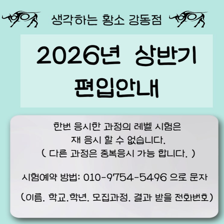 문의 사항 문자는 010-9754-5496 (핸드폰은 문자만 가능하고 통화는 되지 않습니다. ) 시험예약, 취소, 변경등의 문의 사항은 문자로 보내주시면 순차적을 답변드립니다. * 시험예약 방법: 010-9754-5496 으로 문자 (시험과정/ 학교 / 학년 / 학생이름 / 시험 일정, 시간/ 시험결과 받을 전화번호 ) * 타 지점과 중복 응시는 안되며, 학생이 입학하여 다닐 지점에서 시험 예약 바랍니다. * 한번 응시한 과정의 레벨 시험은 재 응시 할 수 없습니다. ( 다른 과정은 중복응시 가능 합니다. ) * 시험은 40문제 1시간50분 입니다. ( 개별 퇴실은 하지 않고 시간에 맞추어 일괄 퇴실 합니다) ( 표가 안 보일 시 왼쪽으로 밀어 주세요) *응시료는 없습....... <img src="https://blogthumb.pstatic.net/MjAyNjAxMTNfMTM2/MDAxNzY4MzAxNDQwNDg5.t0zgivZezkfW-hSssbIFhiceakdEwxiOS5IDykOPqHcg.POISj4h0U_A9LaKwGfDZyjBnvVpeakOrrMMrlf0bpdsg.JPEG/%C1%A6%B8%F1%C0%BB_%C0%D4%B7%C2%C7%D8%C1%D6%BC%BC%BF%E4_-002.jpg?type=s3" />