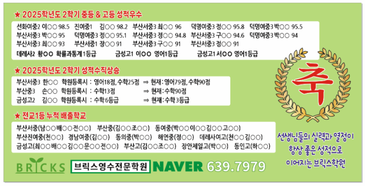 아직 중고등부는 2학기 기말고사를 다 치기도 전 이라는거 초등부 HME결과도 나오기 전 이라는거 + 학교성적이 인생을 좌지우지하는 시대는 지났지만, 공부를 하고, 실패도 해보고, 기쁨도 맛보고, 그 과정에서 얻는 자존감과 성장은 무엇과도 바꿀수 없는 자신만의 자산이며, 언젠가 정말 꼭 하고싶은 일이 생겼을때 그 경험들이 분명히 날개가 되어줄 것입니다. 그래서 브릭스는 아이들이 쉽게 포기하지 않도록 지금 이 순간도 함께하며 돕고 있습니다 남은 2학기도 잘 마무리 할수있게 마지막 시험까지 열심히 하겠습니다 . #브릭스영수전문학원 #부산진구영어학원 #부산진구수학학원 #부산동구영어학원 #부산동구수학학....... <img src="https://blogthumb.pstatic.net/MjAyNTExMjJfMjc0/MDAxNzYzNzkwNDg0NDkx.4GsB3Rd1r5vOchr7Td9Oa1V99wphpVSgA_e_FA00FtQg.MWmnwwPc43COePfqjFGKG7IAd0ZowhvK2mhtu-uaYu8g.PNG/900%A3%DF1763790312773.png?type=s3" />