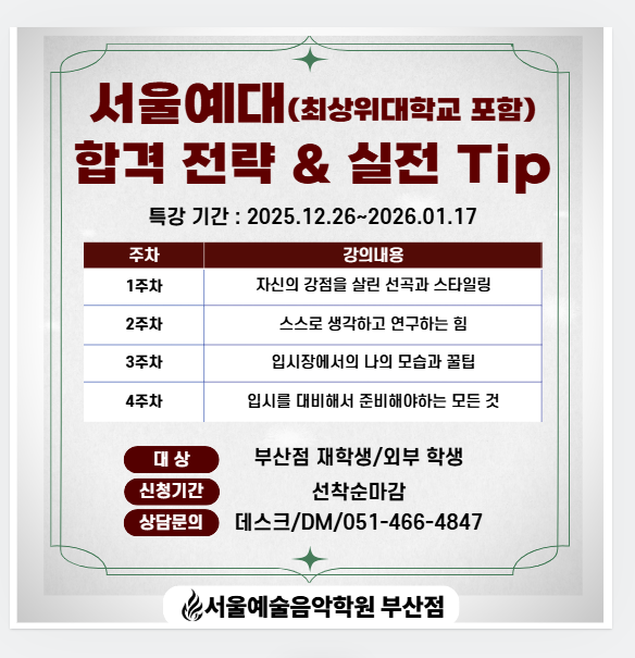 안녕하세요 서울예술음악학원입니다! 오늘은 서울예술음악학원 부산점 특강 소식을 가지고 왔습니다 ! 서울예대/최상위대학 합견 전략 & 실전 팁 특강 ▷실기/면접에서 점수 올리는 전략 ▷자기주도적 연습과 음악 분석 노하우 ▷입시 준비 과정의 모든것 <대상> 입시생 <신청기간> 12월 19일까지 (선착순 마감) <신청/문의> ☎ 051-466-4847 네이버톡톡 이번 특강을 통해 실력,전략,자신감을 한 번에 완성 해보세요! 위치 : 부산광역시 동구 중앙대로 232, 4층 (부산역 도보 3분, 맥도날드 부산역점 옆) 상담문의 : 051-466-4847 위치 : 대구광역시 중구 중앙대로 283, 엠투엠빌딩 4층,5층 (명덕역 7번 출구 도보 2분, 경....... <img src="https://blogthumb.pstatic.net/MjAyNTEyMDRfNjgg/MDAxNzY0ODQwOTY5MzY1.bwXQgOjjqK1wp5QZZhbTmA9agXeUM3QUx15SVNE6YEgg.TtomGVgdNIZnqk9Xt_ch5B3byc5aMp3kxh6uZJXqxQwg.PNG/KakaoTalk_20251126_173918837.png?type=s3" />