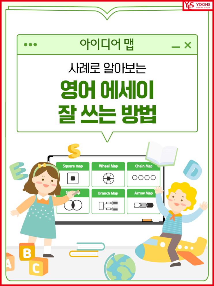 영어 에세이가 막막한 우리 아이! 영어로 글을 쓰려고 하면 첫 문장부터 막막해하는 아이들이 많죠? 단어를 나열하는 수준을 넘어, 자신의 생각을 논리적으로 정리하는 과정이 필요하기 때문입니다. 윤선생에서는 '아이디어 맵(Idea Map)'을 통해 생각의 뼈대를 잡는 훈련을 먼저 시작합니다. 윤선생 회원들은 글을 쓰거나 발표하기 전, 주제에 맞는 6가지 생각 정리 툴을 활용해요. 링맵 (Ring Map): 두 대상의 공통점과 차이점을 한눈에 비교할 때! 브랜치맵 (Branch Map): 하나의 주제를 여러 가지 세부 정보로 확장할 때! 휠맵 (Wheel Map): 중심 키워드에 대한 다양한 특징을 나열할 때! 체인맵 (Chain Map): 사건의 순서나 흐름....... <img src="https://blogthumb.pstatic.net/MjAyNjAzMDNfMjU2/MDAxNzcyNTE5NTc4OTk0.tmmfmA6S8bI_S8TFF8GAt4s6LTmytbt5Z1FfdRrfMU8g.SdETBpsrurYOEU8t2hz76q4zkvZgrNgOfwhcwAw7BQ8g.PNG/1p.png?type=s3" />
